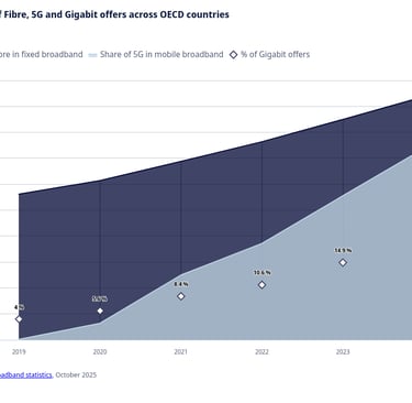 At the same time, demand for high‑speed connectivity is not slowing: gigabit broadband offers have grown nearly fivefold over five years in OECD markets, as digital usage and 5G penetration accelerate.